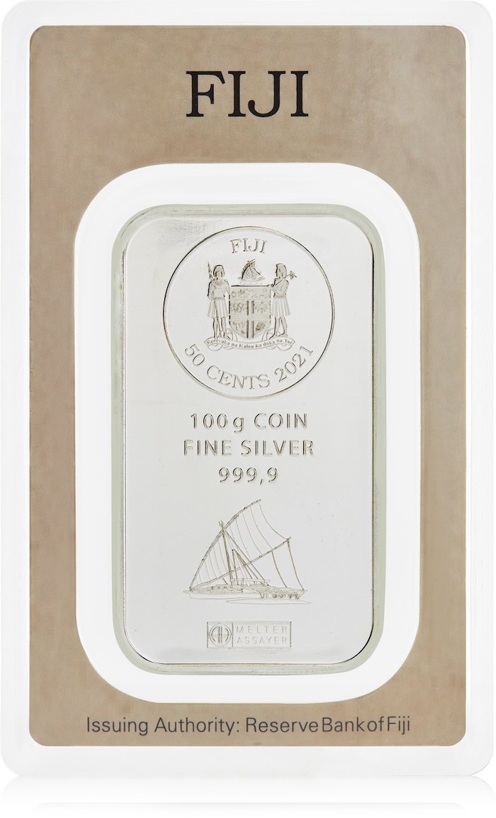 Der Argor Heraeus 100 Gramm Fiji Münzbarren wird im originalen Blister ausgeliefert.