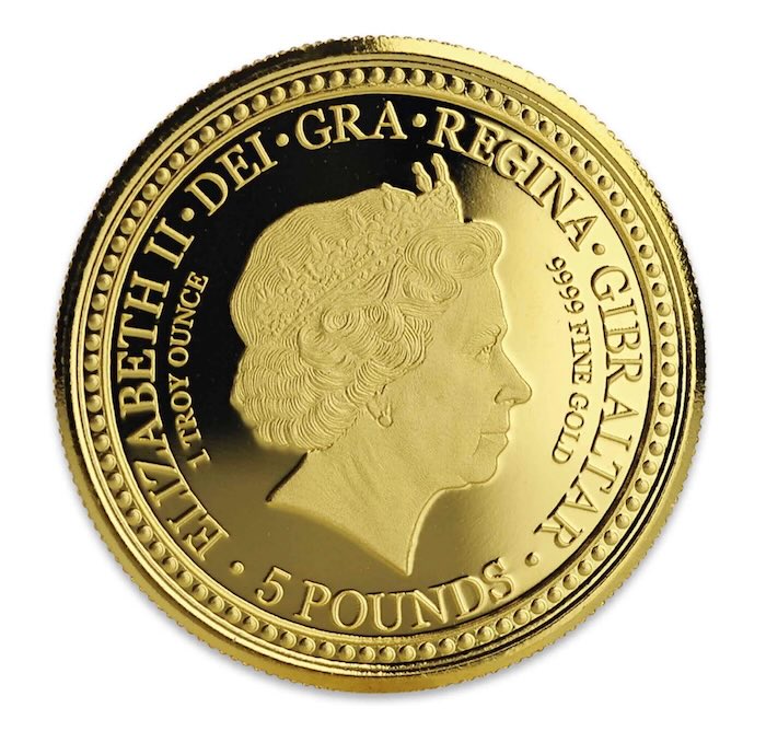 Die Motivseite zeigt das majestätische Royal Arms von Gibraltar, angelehnt an die lange Heraldiktradition des britischen Königshauses. Das Wappen besteht aus fein ausgearbeiteten Strukturen, tiefen Gravuren und klaren, glänzenden Prägeelementen, die im Licht besonders eindrucksvoll wirken. Diese kunstvolle Umsetzung verleiht der Goldmünze eine elegante Erscheinung und macht sie zu einem attraktiven Sammlerstück mit internationaler Anerkennung.
