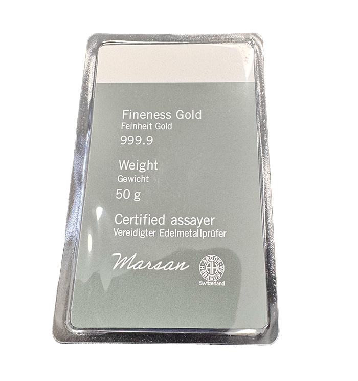 Der 50 Gramm gegossen Goldbarren wird original eingeschweißt ausgeliefert.