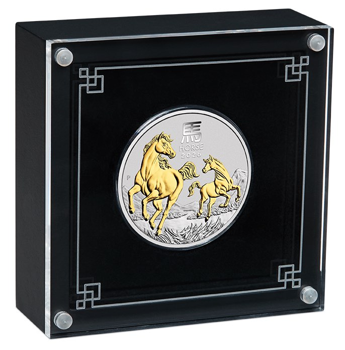 Die Münze Lunar 3 - Pferd - 1 Unze Silber vergoldet 2026, wird inklusive originaler Sammlerbox mit nummerierten Echtheitszertifikat ausgeliefert.