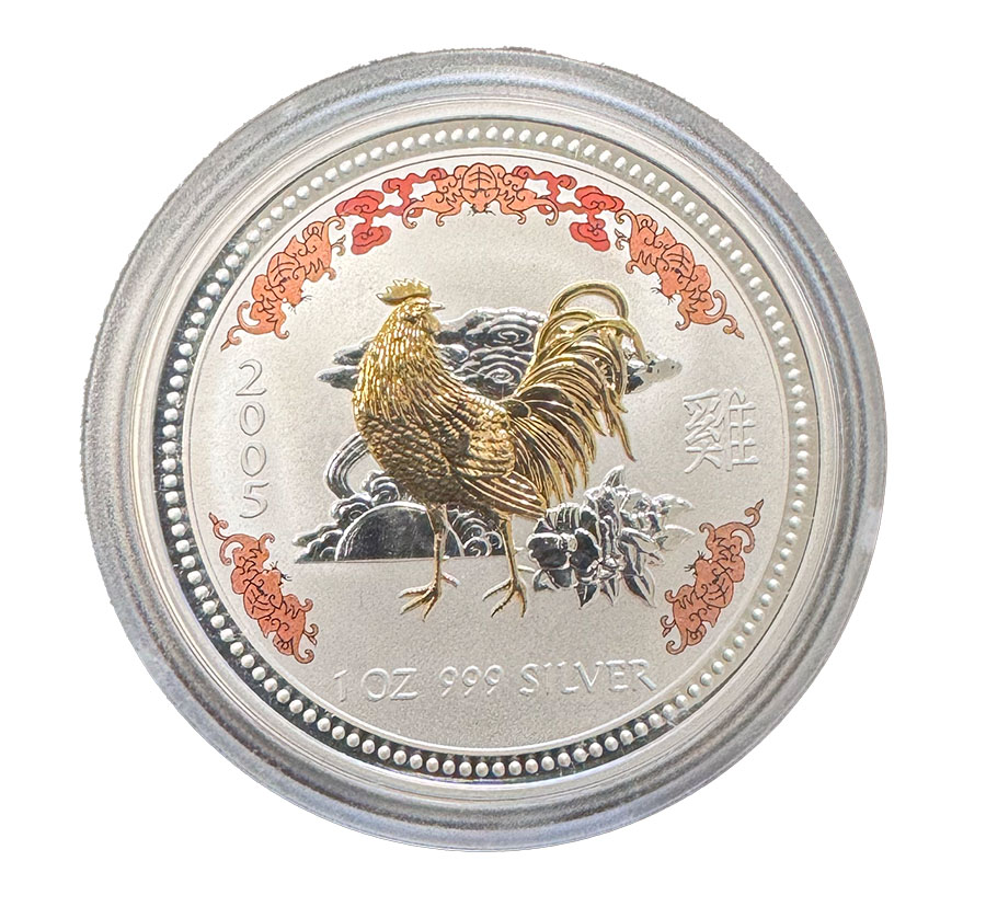 Lunar Serie I - Jahr des Hahn - 1 Unze Silbermünze vergoldet farbig 2005