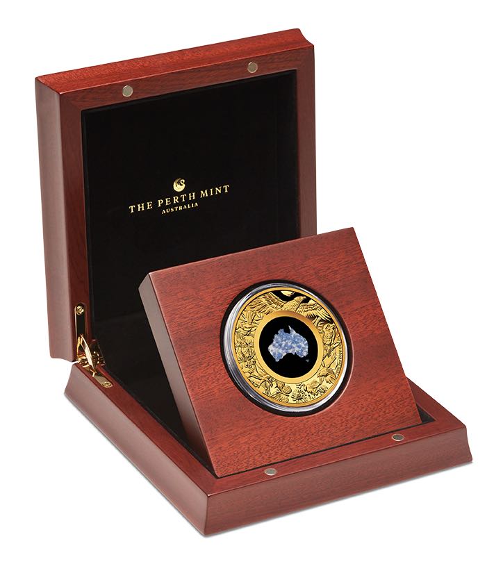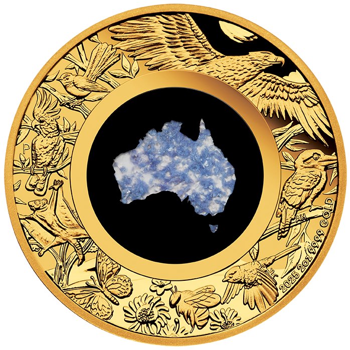 Im Zentrum des Designs befindet sich ein Australien-förmiges Inlay aus Blue Lepidolite, einem Lithium-haltigen Mineral, das nur an einem exklusiven Fundort in Westaustralien vorkommt. Jede Münze ist ein Unikat, da Musterung und Farbgebung des Steins naturbedingt variieren.
