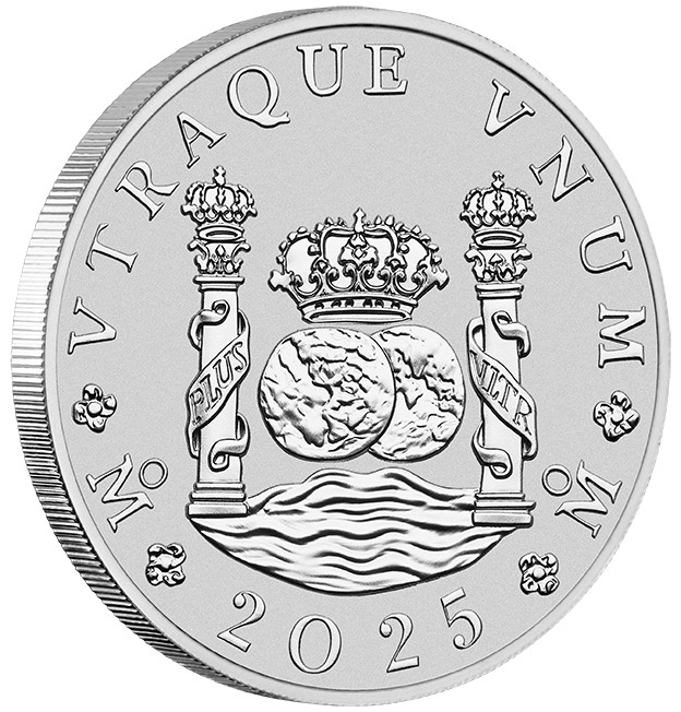 Das Revers der Münze ist dem legendären spanischen Säulendollar („Piece of Eight“) nachempfunden – ein Symbol des transatlantischen Handels. Zu sehen sind die spanische Krone, zwei Weltkugeln (alte & neue Welt) sowie die Herkules-Säulen mit dem Banner "PLUS ULTRA" – ein Verweis auf den Ursprung des Dollarzeichens "$". Ein besonderes Highlight ist das "Mo"-Prägezeichen, das auf die historische Münzstätte in Mexiko-Stadt hinweist.