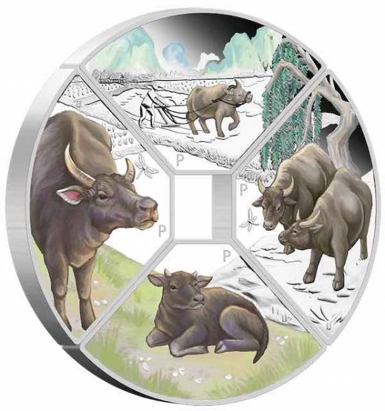 Jahr des Ochsen 2021 Quadrant Set 4 x 1 Oz Silber Proof coloriert + Box + Zertifiakt