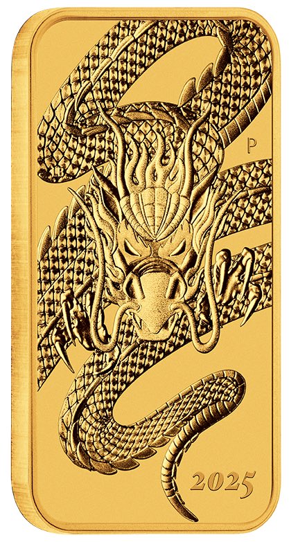Die Rückseite der 1-Unze-Goldmünze zeigt einen fein gearbeiteten Drachen mit geschwungenem Körper, offenen Klauen und dynamischen Schuppen. Das Motiv verkörpert die traditionelle Symbolik des Ostens und wird ergänzt durch die Prägung „2025“ sowie das charakteristische „P“-Mintmark der Perth Mint.