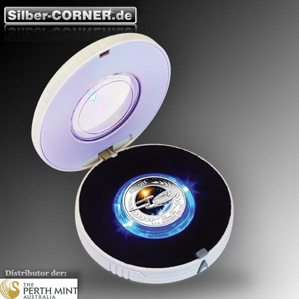 Die Münze wird gekapselt in einer Star Trek typischen Sammlerbox ausgeliefert. In diese Box ist eine Leuchtdiode eingearbeitet, welche beim öffnen die Münze von unten bleuchtet.