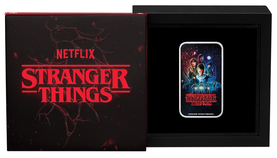 Die Vorderseite zeigt das berühmte Poster-Design der ersten Staffel, mit den Hauptfiguren Mike, Dustin, Lucas und Eleven sowie der düsteren Kulisse von Hawkins. Das Stranger Things-Logo und das „P“-Prägestempel der Perth Mint runden das Motiv ab.