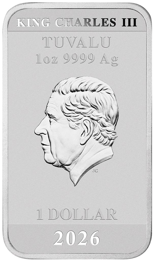 Auf der Rückseite ist das Porträt von König Charles III. (nach einem Entwurf von Jody Clark) zu sehen, ergänzt durch Gewicht, Reinheit, Nennwert und das Prägejahr 2026.