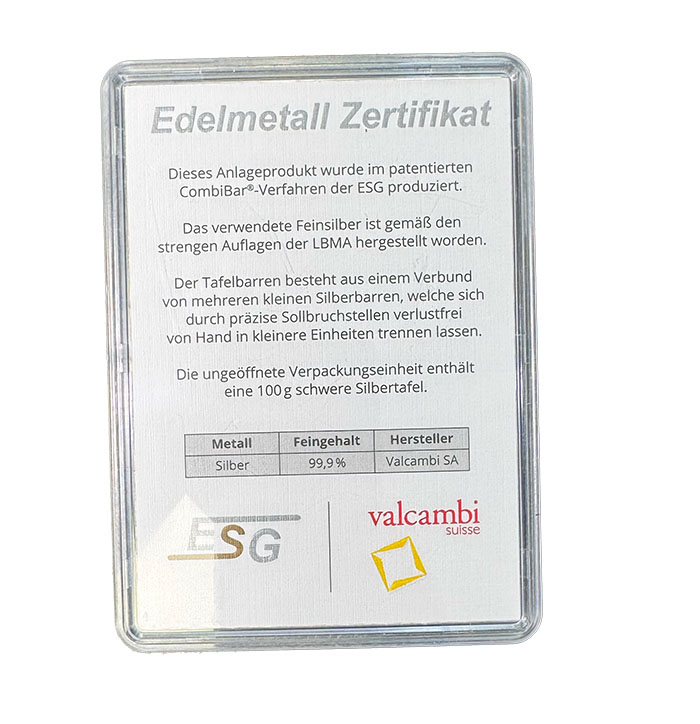 Sie kaufen den 100 x 1 Gramm Valcambi Combibar aus Silber. Der Barren wird mit einer Acrylverpackung und Zertifikat ausgeliefert.