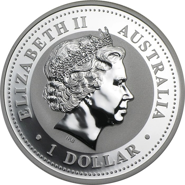 Wenn Sie den Silber Kookaburra 2001 kaufen, sichern Sie sich ein Design, das in der Serie eine Besonderheit darstellt. Das Revers (Rückseite) zeigt zwei Kookaburras, die gemeinsam auf einem Ast eines Eukalyptusbaumes sitzen. Während der vordere Vogel nach links blickt, ist der hintere Kookaburra leicht versetzt dargestellt. Der Hintergrund besticht durch ein feines, radiales Linienmuster, das typisch für die frühen Jahrgänge der Perth Mint ist. Die Umschrift „THE AUSTRALIAN KOOKABURRA“, das Gewicht von 1 oz, die Feinheit .999 SILVER sowie das Prägejahr 2001 rahmen das Motiv stilvoll ein. Auf der Vorderseite befindet sich das Porträt von Queen Elizabeth II sowie der Nennwert von 1 Dollar.