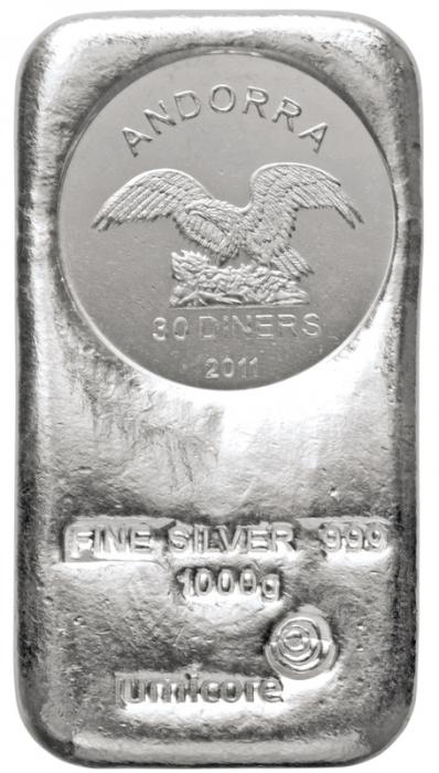 Umicore 1 Kg Silber Münzbarren Andorra 30 Diners*